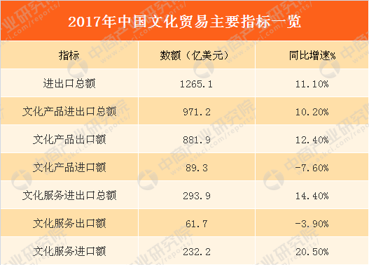 近年來,中國(guó)文化貿(mào)易實(shí)現(xiàn)快速增長(zhǎng)。根據(jù)商務(wù)部信息,2017年我國(guó)文化產(chǎn)品和服務(wù)進(jìn)出口總額1265.1億美元,同比增長(zhǎng)11.1%。其中,文化產(chǎn)品進(jìn)出口總額971.2億美元,同比增長(zhǎng)10.2%;文化服務(wù)進(jìn)出口總額293.9億美元,同比增長(zhǎng)14.4%。