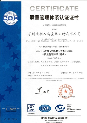 康利建立了完善的質(zhì)量保證體系,是行業(yè)中率先通過(guò)ISO9001質(zhì)量管理體系認(rèn)證、ISO14001環(huán)境管理體系認(rèn)證的企業(yè),并且是石材國(guó)家標(biāo)準(zhǔn)《天然大理石建筑板材》、《天然花崗石建筑板材》的起草單位之一。